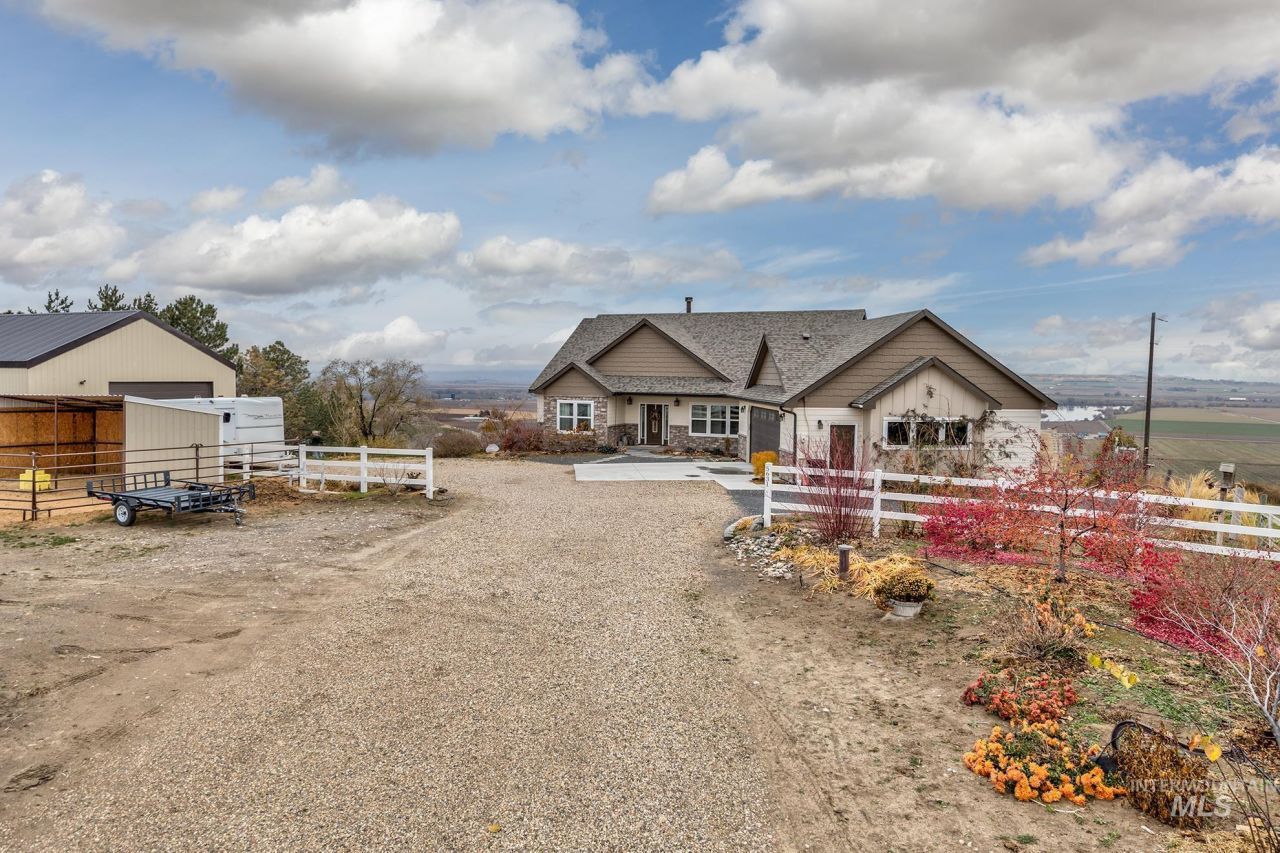 Breathtaking, one-of-a-kind views of the Snake River and surrounding valley define this stunning custom modern farmhouse. With 3,900 sq. ft. of beautifully designed living space, this 4-bedroom, 4-bath home offers an open, inviting floor plan perfect for both everyday living and entertaining. The gourmet kitchen features granite countertops, a large center island, and seamless flow into the great room. Enjoy year-round natural light in the spacious 3-season sunroom, or step out onto the deck to take in panoramic river and valley vistas. Situated on 3.03 irrigated acres, the property is fully fenced and cross-fenced?ideal for animals? and includes a 30 x 40 powered shop plus a 30 x 16 lean-to for additional storage or workspace. Conveniently located near I-84, schools, and shopping, this exceptional property perfectly blends privacy, modern comfort, and rural charm?all with unmatched views.